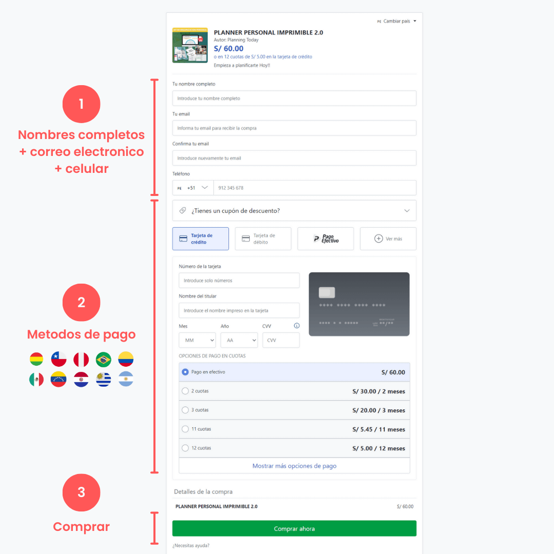 Al hacer clic en los botones de compra en color verde, serás redirigido automáticamente a una página donde se mostrará el precio del producto en tu moneda local. También encontrarás los métodos de pago disponibles para tu país. Adquierelo desde Aqui!